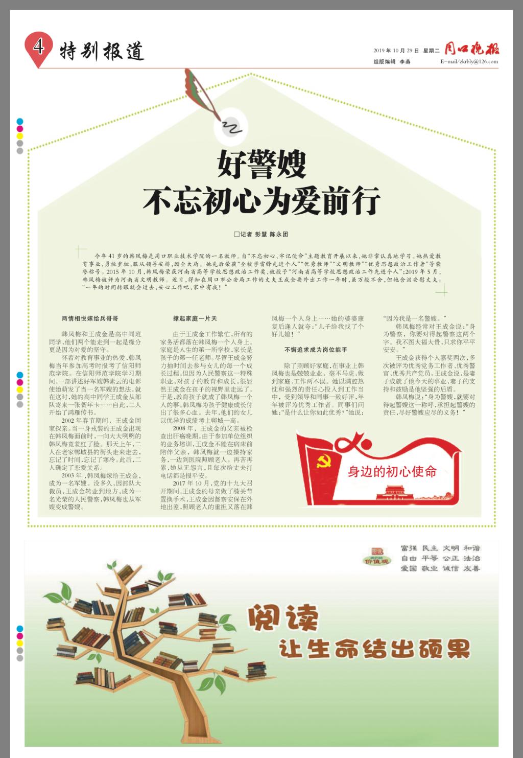核心阅读:韩凤梅有着多个“身份”——警嫂、教师、党员,但她最在意的还是“中国共产党党员”这个响亮的身份。今年41岁的韩凤梅是yl6809永利一名教师。“不忘初心、牢记使命”主题教育活动开展以来,韩凤梅积极参与学习,热爱党的教育事业,爱岗敬业、为人师表、勇挑重担,服从领导安排,始终顾全大局。所在的党支部2018年被评为市直机关先进基层党组织。多次荣获全校学雷锋先进个人、优秀教师、文明教师、优秀思想政治工作者等荣誉称号。2015年10月获得河南省高等公司思想政治工作奖,被授予“河南省高等公司思想政治工作先进个人”荣誉称号;2019年5月被评为河南省文明教师。一周前,在周口市公安局工作的丈夫王成金要外出工作一年,她虽然万般不舍,但依然含着眼泪安慰丈夫:“一年的时间转眼就过去了,安心工作吧,家中有我!”