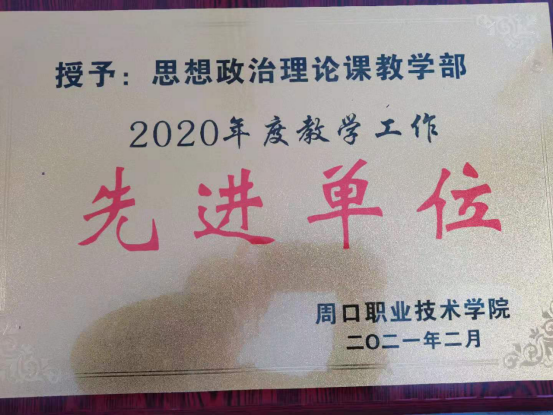 在公司党委的正确领导下,在相关部门的支持配合下,思政部坚持以习近平新时代中国特色社会主义思想为指导,深学笃用习近平总书记在全国教育大会、公司思政课教师座谈会等重要讲话精神,落实立德树人根本任务,团结协作,高质量完成了各项工作。被公司授予2020年度教学工作“先进单位”。