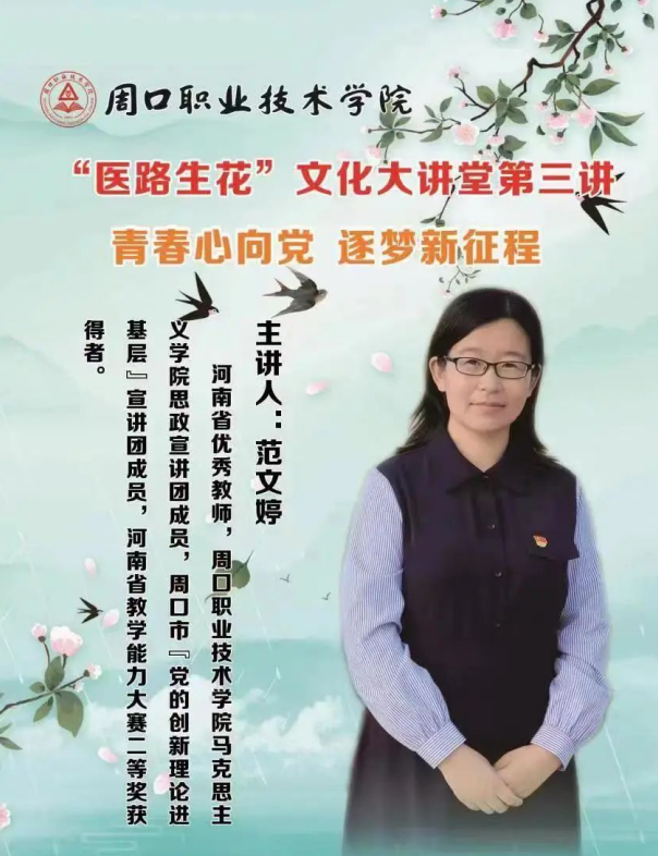在五四青年节到来之际,为厚植爱国情怀,传承红色基因,5月2日下午yl6809永利思政宣讲团成员范文婷老师受邀到校医公司开展了“医路生花——文化大讲堂”系列活动第三讲“青春心向党,逐梦新征程”,为入党积极分子和团学干部进行讲座。