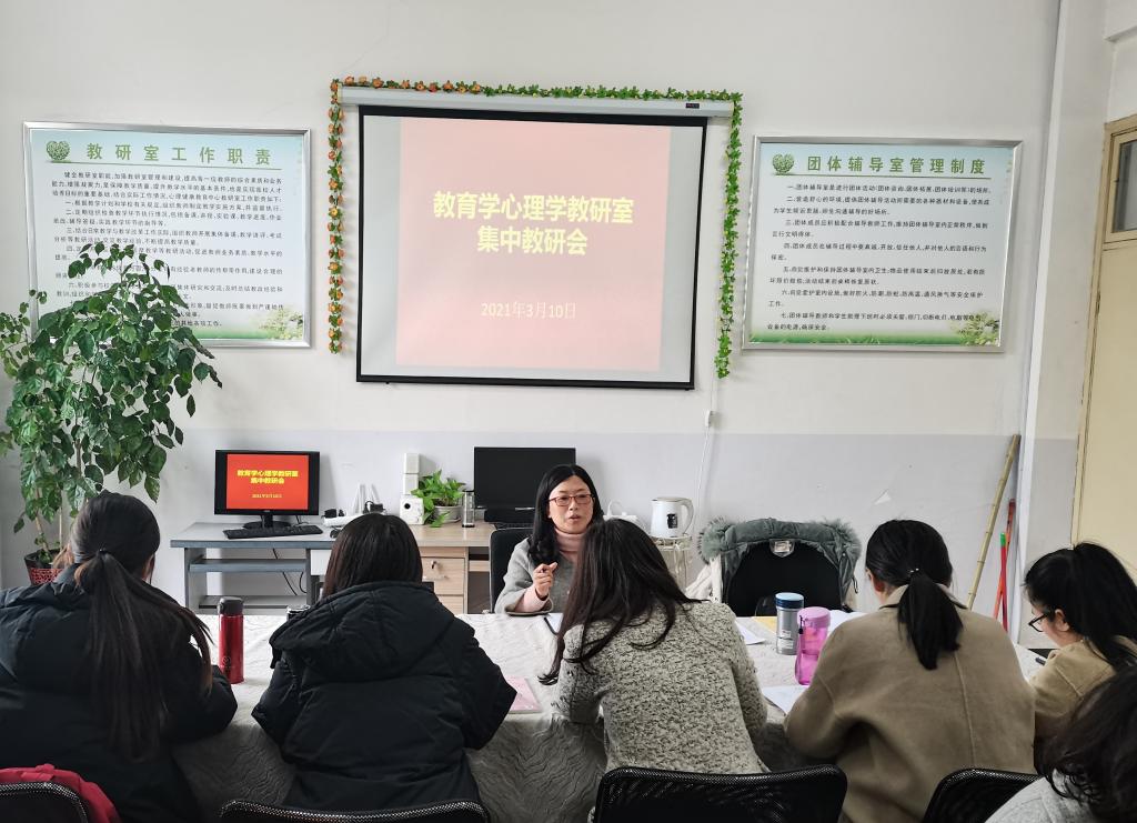 心理健康教育中心耿润主任首先向大家传达了公司工作会议精神,并对近期教研工作进行了安排。耿主任对心理健康教育工作的重要性、分清主次工作、落实实际、打造精品讲座、员工心理发展的引导等五个方面进行了详细的讲解。并重点提出,对于教学,做到多总结、多思考,争取更多的教学改革。最后,全体教师根据本学期所承担的课程任务分组进行讨论,并分享交流各自的备课情况与教学经验。