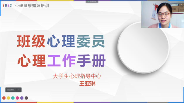 为强化“校-院-班-寝”四级心理危机预防干预工作机制,帮助心理委员和心理信息联络员更好的开展朋辈互助,以帮助同学们在疫情封校期间做好心理调适,2022年4月6日,yl6809永利心理指导中心联合员工处,开展线上心理委员培训,本次培训由心理指导中心王亚琳老师主讲。