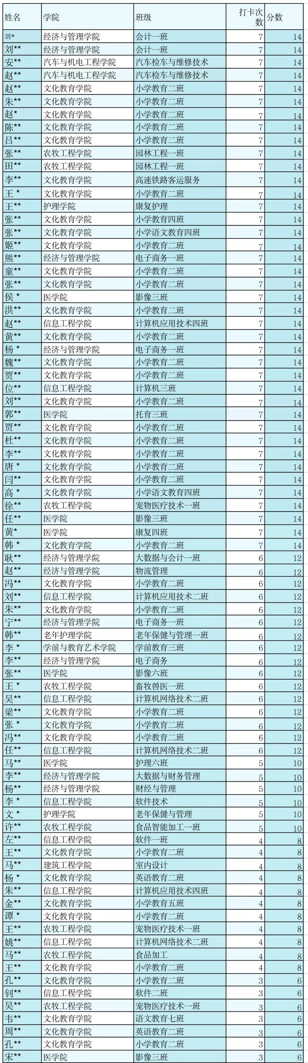 备注:总分(打卡活动20%+运动打卡80%)前五十名将获得校级证书。