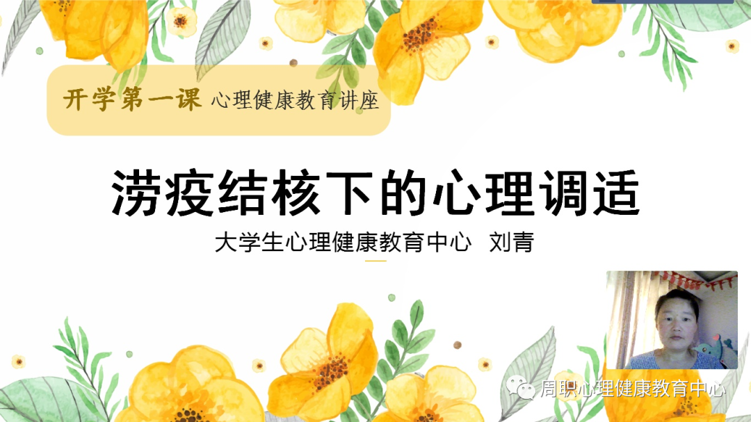 刘青老师主要从涝疫结核下常见的情绪问题及其调节方法、涝疫结核下的积极心理建设、涝疫结核下老员工开学后的适应策略等三个方面与同学们进行了交流,希望同学们适应当前线上教学方式,能在遇到相关问题时及时有效地作出应对,并在线下开学后尽快融入新的校园生活。