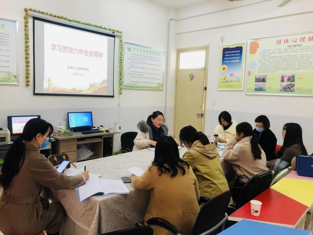 12月1日下午,思政部心理指导中心在四楼团体室召开专题党课,学习贯彻党的十九届六中全会精神。中心全体教师参加了本次党课,党课由教育学心理学教研室主任刘青主讲。