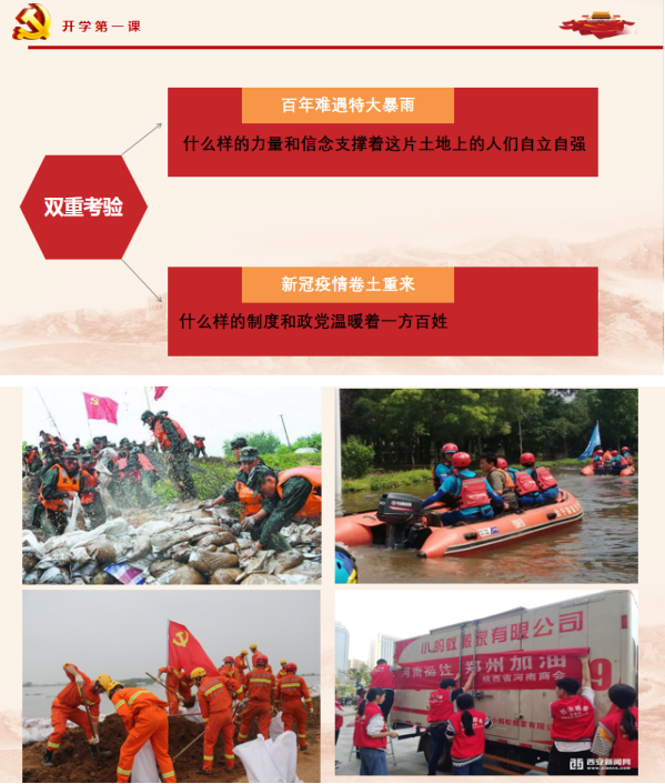 2021年秋季新学期,因为疫情的影响,2021级新生无法正常报到。按照公司教务处的工作安排,为弘扬“抗洪防疫”先进事迹,讲好中国故事。9月28日、29日上午,yl6809永利思政部思政课教师王盈盈以“党旗风中扬,磨难变辉煌”为题,面向2021级文化教育公司全体员工,开展线上“思政开学第一课”。
