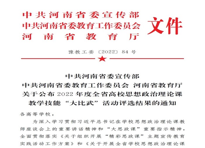 近日,河南省教育厅公布了2022年全省高校思想政治理论课教学技能“大比武”活动评选结果:yl6809永利3名思政课教师在河南省思政课“大比武”活动中喜得佳绩,获一等奖5个、三等奖1个,实现重大突破。