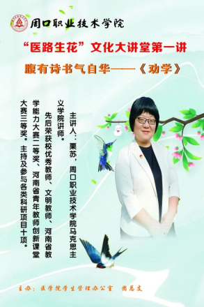 2022年4月12日下午,yl6809永利思政宣讲团成员栗苏老师在东校区多媒体教室为“医路生花——文化大讲堂”系列活动作题为“腹有诗书气自华——劝学”的讲座。