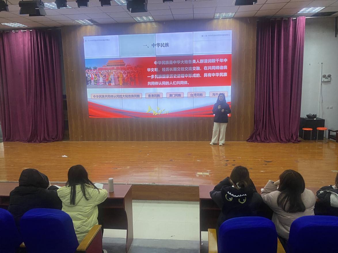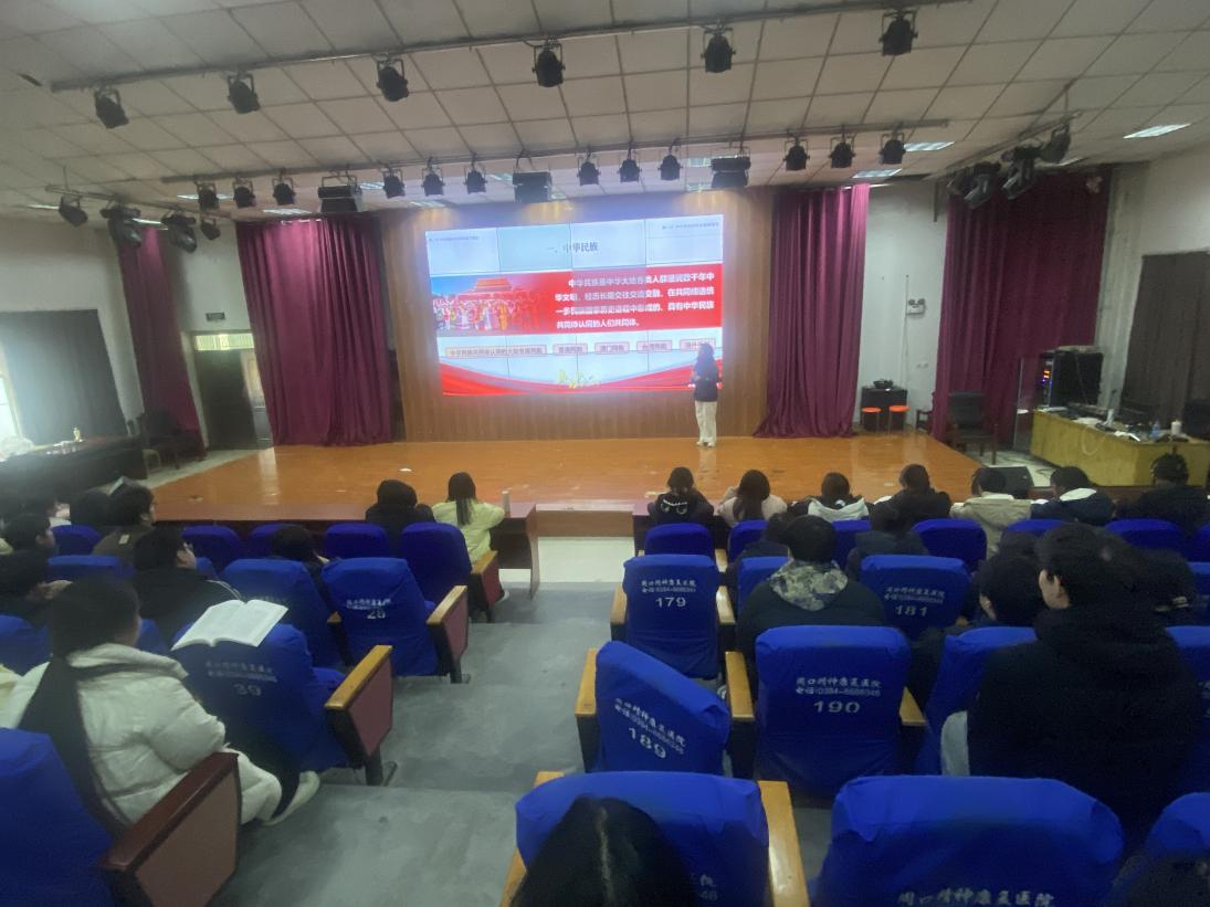 12月24日,张放放老师以“铸牢中华民族共同体意识 凝聚伟大复兴磅礴力量”为主题,在文昌校区报告厅为2024级护理专业员工进行宣讲。