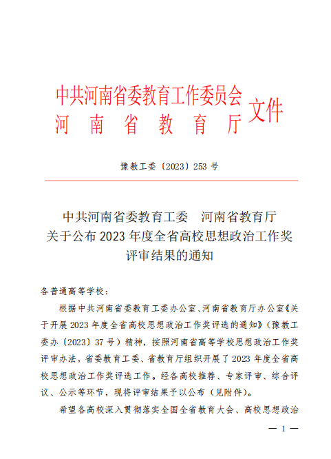 由中共河南省委高校工委、河南省教育厅组织开展的2023年度全省高校思想政治工作奖评选结果揭晓,yl6809永利申报的《“课社协同”思政育人模式》荣获“河南省高校思想政治工作优秀品牌”。